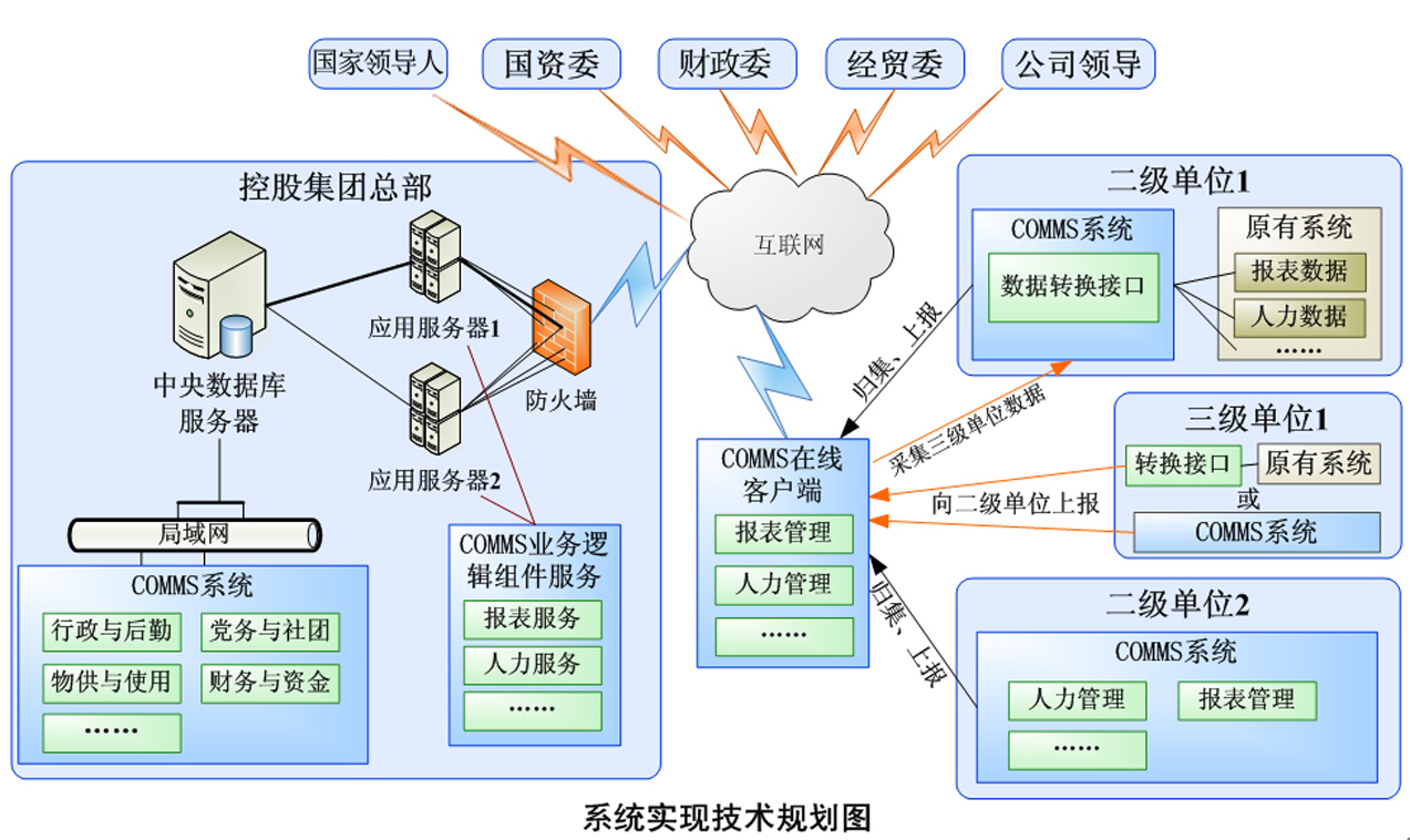 下图所示,系统为典型的三层应用结构。整个集团构建统一的数据存储中心,数据库层搭建在控股集团总部的中央数据库服务器集群;中间业务逻辑层运行在集团总部的一台或多台应用服务器上,通过防火墙对互联网外的终端用户提供服务;各下属企业及其子公司使用COMMS在线客户端程序通过互联网进行通讯,访问集团总部的中间层应用服务器,再由应用服务器读取统一的中央数据库获取数据。